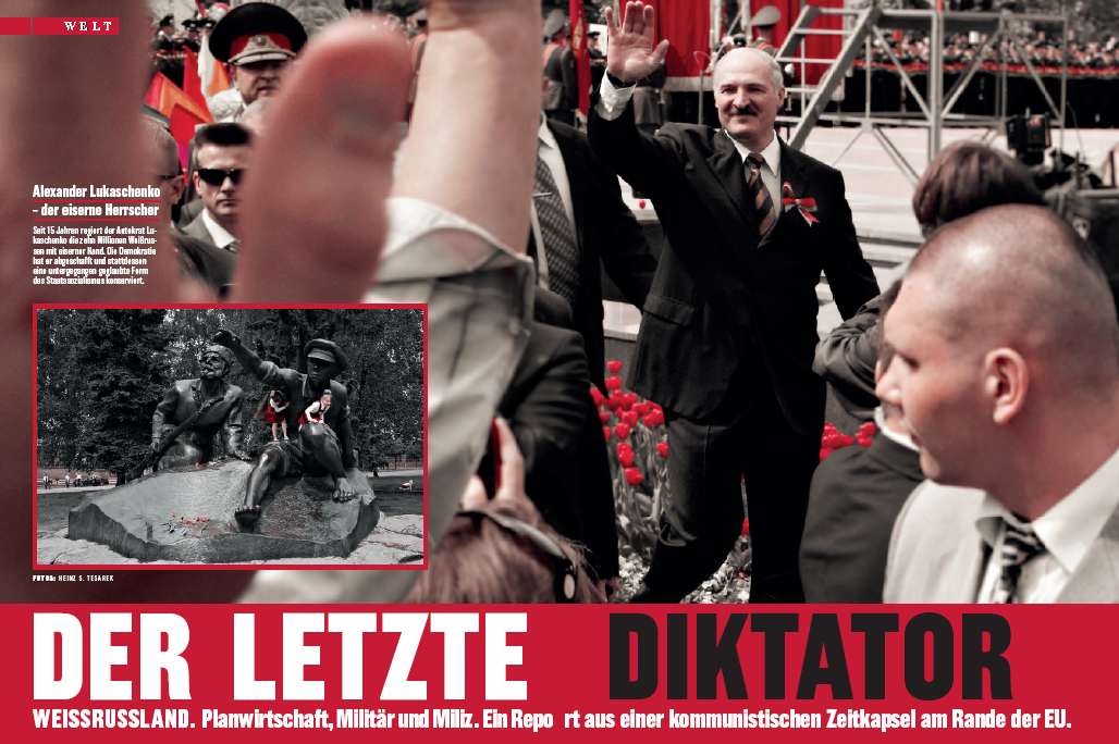 Minsk am vergangenen Samstag, dem 9. Mai. Der „Tag des Sieges“ der Roten Armee über Nazi-Deutschland jährt sich zum 64. Mal, und Weißrusslands Hauptstadt präsentiert sich wie auf vergilbten Bildern aus den späten 70er-Jahren. Spruchbänder mit heldenhaften Parolen zieren die breiten Boulevards, Veteranen sind aufmarschiert, tragen teils Lenin und Stalin-Konterfeis in ihren Händen, lauschen der Marschmusik, salutieren den Truppen und warten auf ihren anscheinendfotoscheuen Präsidenten – Alexander Grigorjewitsch Lukaschenko. 15 Jahre ist er im 10-Millionen-Einwohner-Staat zwischen Polen, der Ukraine und Russland schon an der Macht und regiert das Land seither mit eiserner Hand.