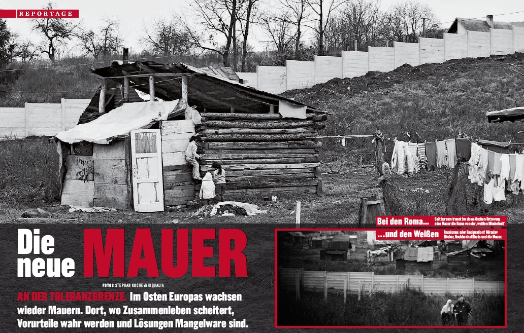 „Die weiße Minderheit“ Der Blick fällt auch auf Betonblöcke: Weiß, massiv und übereinandergelagert, ergeben sie eine mehr als zwei Meter hohe und 200 Meter lange Barriere, eine Absperrung, eine Mauer – die Mauer von Ostrovany. Während sich dieser Tage tausend Kilometer entfernt Berlin darauf vorbereitete, dem Fall der Mauer vor 20 Jahren zu gedenken, fuhren in Ostrovany Bagger auf, um eine neue zu errichten. Was einst Ost und West trennte, soll hier, die zur Minderheit gewordenen „Weißen“ vor den, die Mehrheit stellenden „Schwarzen“, schützen.