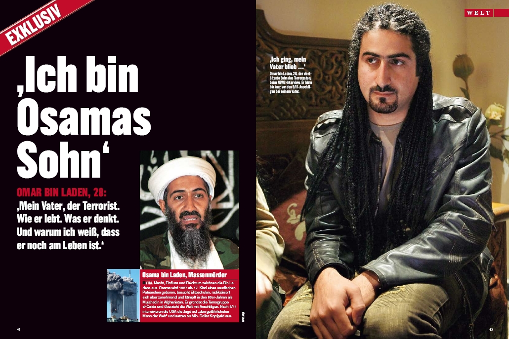 Bin Laden: Ich war im Haus meiner Großmutter in Jeddah in Saudi-Arabien und schlief, als mein Onkel plötzlich ins Zimmer stürmte und rief: „Schau, was dein Vater angerichtet hat!“ Als ich dann die einstürzenden Twin Towers sah, konnte ich nicht glauben, dass mein Vater für all das verantwortlich sein sollte, ich betete dafür, dass es nicht stimmte, und weigerte mich noch Monate, auch nur anzunehmen, mein Vater könnte hinter all dem stecken.