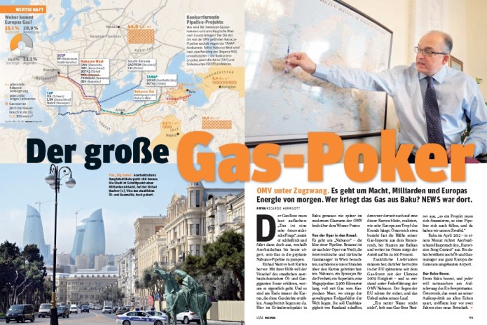 „Von den Nabucco-Herren bekamen wir zu hören, dass sie zwar unser Gas gern hätten, aber auch jenes aus Turkmenistan, vielleicht dem Irak oder gar dem Iran. Wir sagten: Gut,zehn Milliarden Kubikmeter liefern wir – um den Rest kümmert ihr euch. Doch bis heute gibt es keinen Rest“, sagt Gas- Boss Nasirov und zeigt auf eine geplante Pipeline durchs Kaspische Meer nach Turkmenistan, die wegen Grenzstreitigkeiten immer unrealistischer wird.