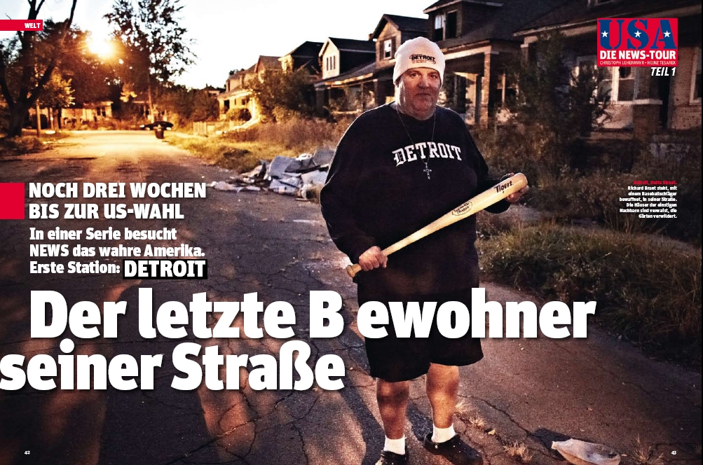 Steht Richard auf seiner Veranda, was er ohnedies selten tut, sieht er dem Verfall direkt ins Auge. Vor ihm: Häuser, die seinem glichen und nun nur noch Ruinen sind. Zerborsten das Gebälk, oft ausgebrannt das Innere. Wuchernde Wildnis im Garten und benutzte Spritzen auf dem Boden. Dazwischen verblichene Fotos der letzten Bewohner. Die Erstkommunion der Tochter, das Geburtstagsfest des Opas. Und irgendwo eine Zeitung mit Präsident Bill Clinton auf der Titelseite. „Die da drüben sind nach Texas gezogen. Die daneben nach Florida. Und die dort hinten, so ’ne rattenscharfe Schwarze, die wurde erschossen.“ Ganz nüchtern erklärt Richard, wie sich seine Straße leerte. Wie es dazu kam, dass alle gingen und bloß er blieb.