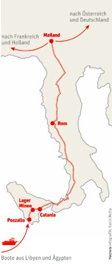 Drei Tage später, vor dem Bahnhof von Catania, der zweitgrößten Stadt Siziliens. Die Piazza Giovanni XXIII bietet wenig Päpstliches, dafür einen Kreisverkehr, in dem jeder Fahrer um Millimeter kämpft und das Recht des Stärkeren gilt. Im Park gleich nebenan ist es ähnlich. Er ist voll von Gestrandeten, die das Schicksal hier angespült hat. Junge, arbeitslose Sizilianer versuchen als Parkplatzeinweiser ein paar Euro zu verdienen. Flüchtlinge aus Afrika, die kein Geld für die Weiterfahrt haben, ertränken ihren Frust in Alkohol. Vor dem Brunnen von Seegott Neptun, der ein barbusiges Mädchen festhält, kauert eine Gruppe im Gras. Und tatsächlich: Ibrahim, der Mann mit dem Plan, ist dabei. Erstmals können wir mit ihm sprechen. Er erzählt, er sei Lehrer in Syrien gewesen und aus Homs, der drittgrößten Stadt des Landes, geflohen, nachdem Assad daraus ein zweites Stalingrad gemacht hatte. „Erst nach Ägypten, und als dorthin immer mehr Syrer flüchteten und die Stimmung uns gegenüber ständig feindseliger wurde, war es Zeit für Europa.” Zwölf Menschen umfasst Ibrahims Gruppe, darunter Alima, seine Nichte, die einzige Frau. Sie hat zwei Buben, zwei und vier Jahre alt. Nach einiger Zeit holt ihr Ehemann sein Handy hervor. Zeigt die Bilder eines rostigen Kahns, darauf er und seine Familie. Dann löscht er die Fotos, damit keine Beweise bestehen, dass sie je in Italien an Land gingen.