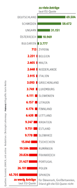EU-Flüchtlingsquoten: Die EU regt an, Flüchtlinge nach Quoten aufzuteilen. Demnach hätte 2014 etwa Österreich 10.969 Asylanträge zu viel bearbeitet. Spanien hätte hingegen 45.705 Asylwerber mehr erhalten